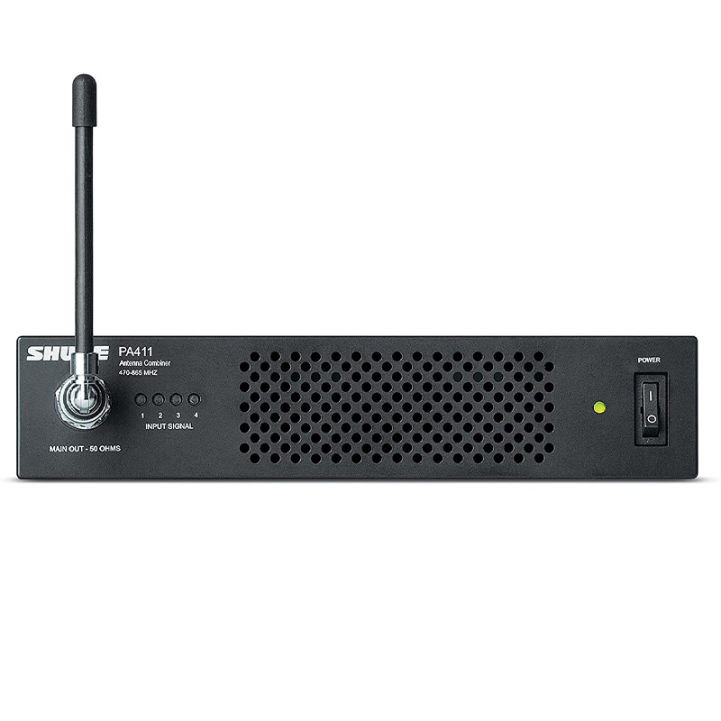 Combinador de antena que distribuye alimentación DC y señal RF para un máximo de 4 transmisores PSM300. El compacto sistema de medio ancho de rack reduce el número de antenas y fuentes de alimentación necesarias cuando se usan múltiples sistemas. El combinador de antena Shure PA411 distribuye alimentación DC y señal RF para un máximo de 4 transmisores Shure PSM®300. El compacto sistema de medio ancho de rack reduce significativamente el número de antenas y fuentes de alimentación necesarias cuando se usan múltiples sistemas.