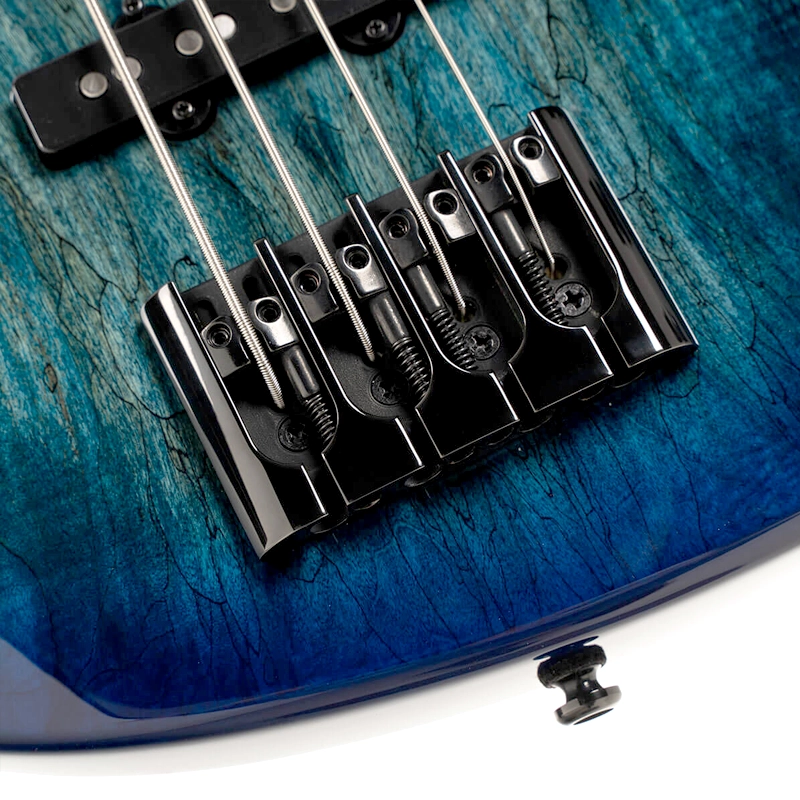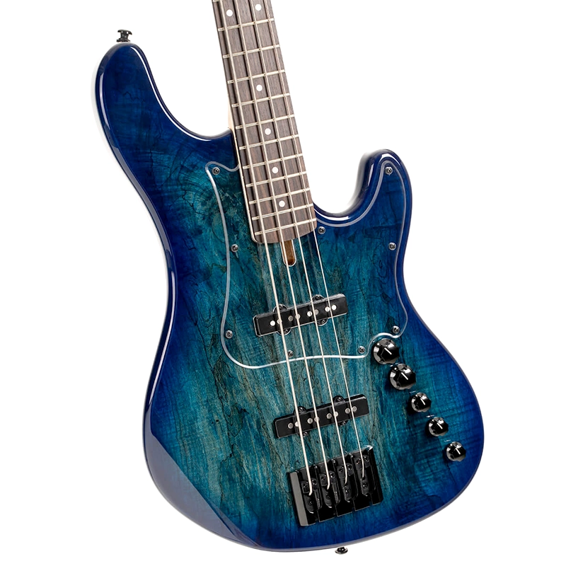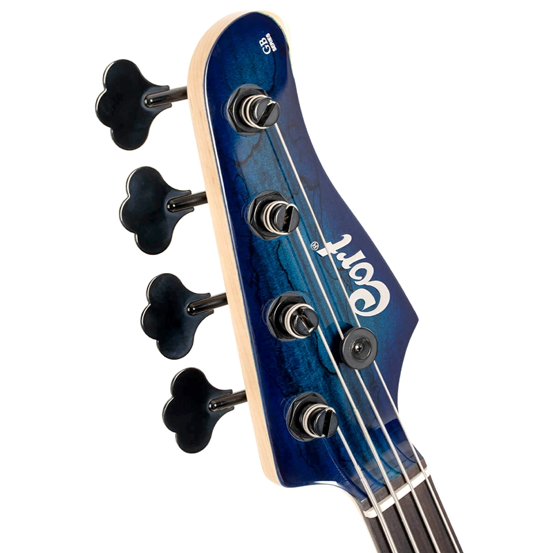 El acabado Blue Burst transparente permite apreciar la belleza natural de la madera, convirtiendo a la Cort GB-Fusion 4 BB en una pieza central tanto visual como sonora en el escenario.