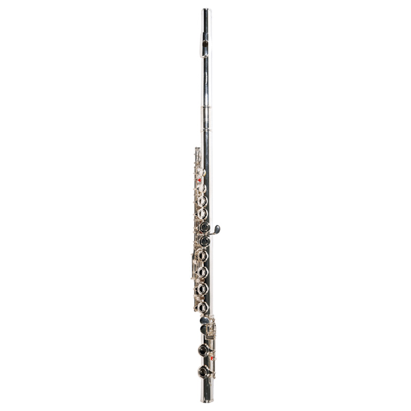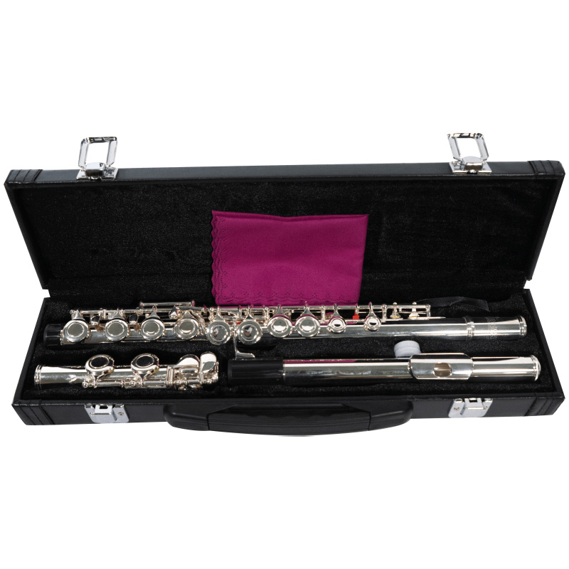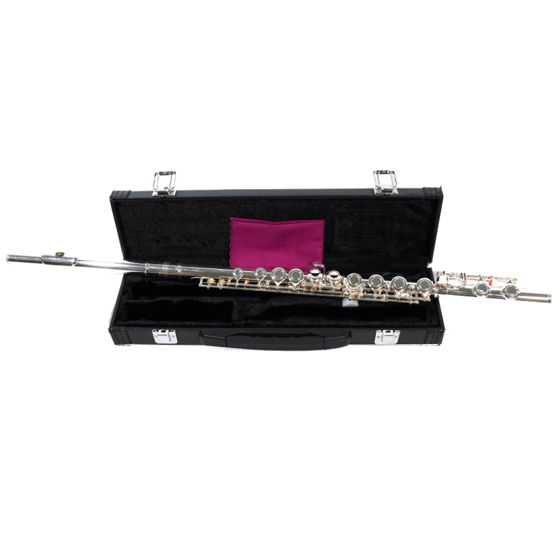 Flauta transversal en Do, con llaves cerradas, bañada en plata y con un estuche elegante, incluye también guantes, un bastoncillo y un paño de limpieza.