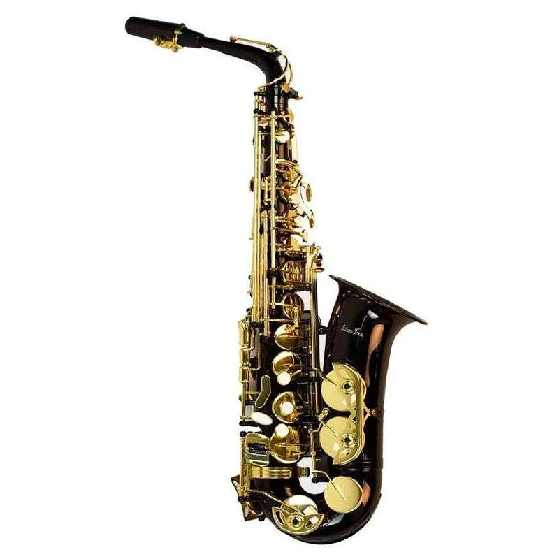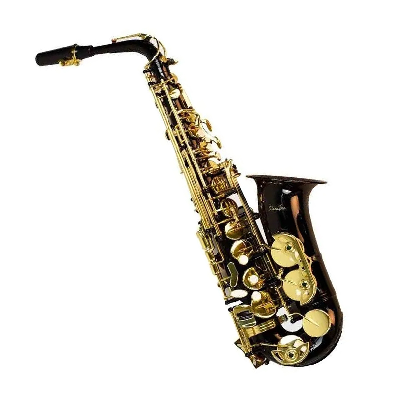 Saxofon Alto Profesional En Mi B (Eb), Terminado Laca Color Negro Llaves Doradas, Materiales del Cuerpo de Laton, Rango: De Si B (Bb) A Alto Fa Sostenido (F #), Llave Auxiliar De Espatula Para F#.