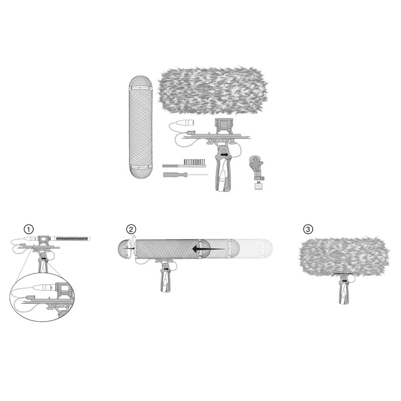 Cápsula paravientos que rodea completamente el micrófono y su conector, y que se desliza hasta el sistema de suspensión. El antivientos de plumilla sintética de alta calidad está diseñado para ajustarse perfectamente al paravientos. Cuenta con un cordón de cierre y un fijador para un ajuste perfecto. El paravientos y el peluche antiviento atenúan hasta 38 dB de ruido del viento.