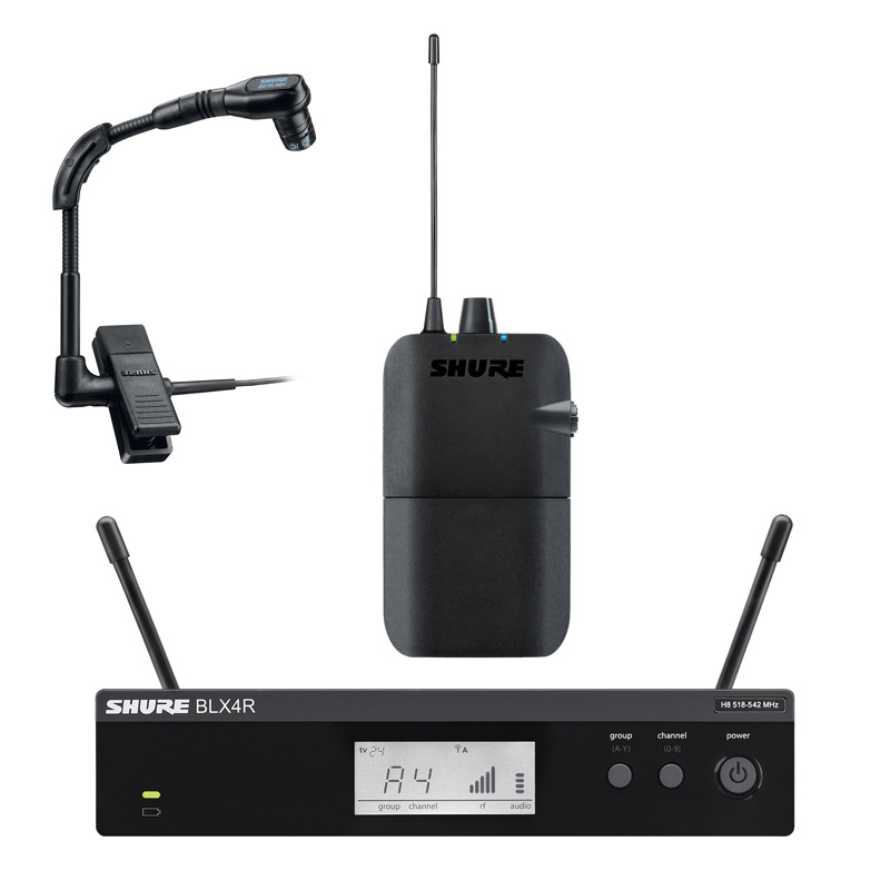 Shure Sistema de micrófono inalámbrico BLX14R/B98 con receptor de montaje en rack BLX4R, transmisor BLX1 y micrófono de instrumento de cuello de cisne BETA 98H/C para instrumentos de latón, viento de madera y percusión.
