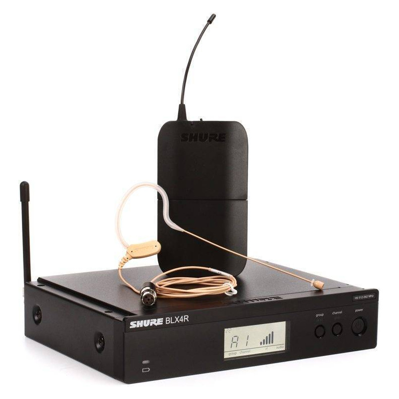 Sistema de micrófono inalámbrico Shure BLX14R/MX53 con receptor de montaje en rack BLX4R, BLX1 Bodypack y MX153 Auricular Headworn Subminiatura Mic para presentaciones, casas de culto y sonido en vivo.